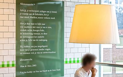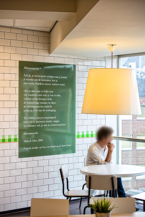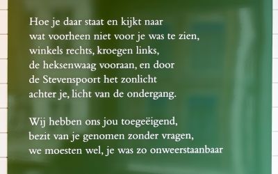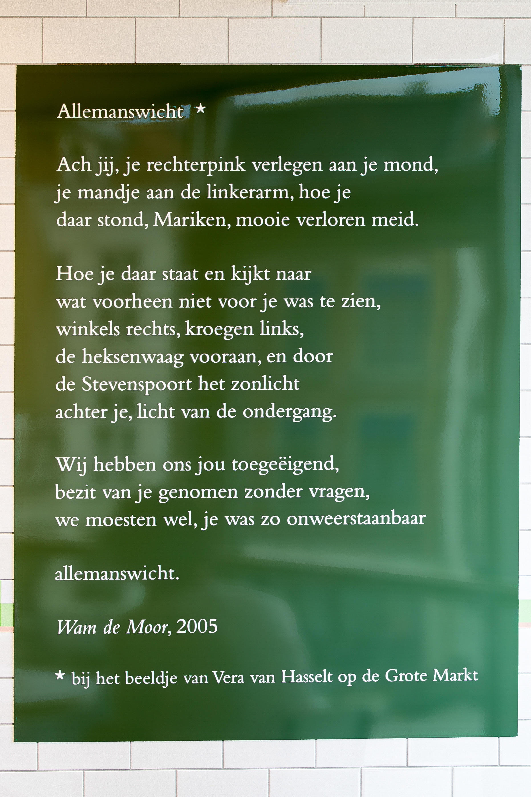 Dit gedicht verwijst naar het beeld van Mariken van Nieumeghen, gemaakt door beeldhouwster Vera Tummers-van Hasselt, dat sinds 15 november 1957 op de Grote Markt in Nijmegen staat. Het werd destijds geschonken aan de stad door de directeur van de Nijmeegse vestiging van Vroom & Dreesmann, Rudolf Vroom. Hij had een eerste versie van het beeld gezien bij de kunstenares thuis en vond dat het een plek moest krijgen in Nijmegen. Mariken is gebaseerd op het middeleeuwse mirakelspel Mariken van Nieumeghen. Met de komst van het beeld werd ze, meer nog dan voorheen, symbool van de stad en eigendom van alle Nijmegenaren. Het gedicht, onthuld op 15 mei 2015, is aangebracht op een wand in het restaurant op de tweede etage van de HEMA, van waaruit men uitzicht heeft op het beeld.