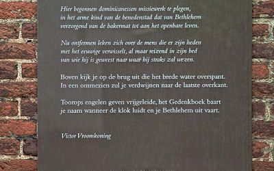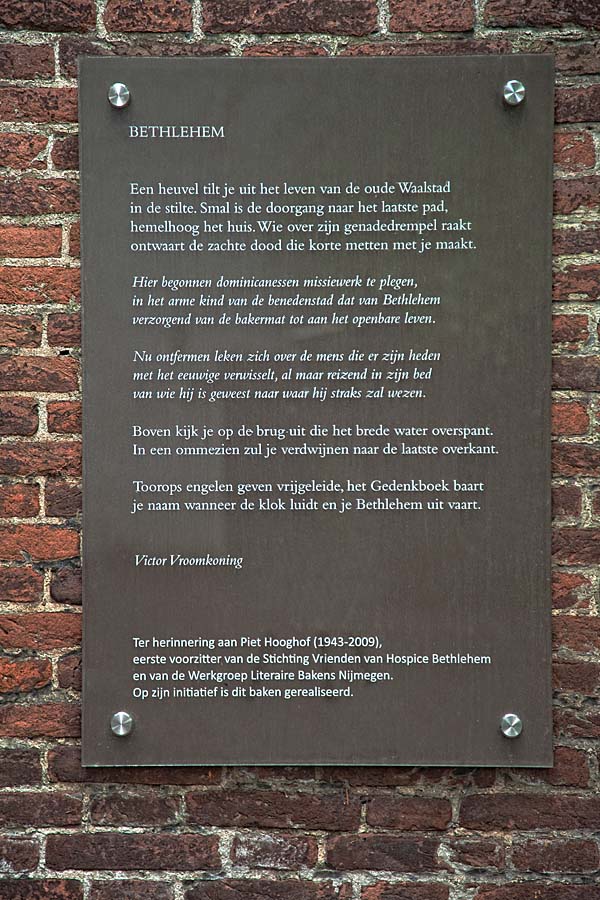 Het gedicht Bethlehem schreef Victor Vroomkoning op verzoek van Hospice Bethlehem te Nijmegen ter gelegenheid van het vijfjarig bestaan. Dit baken op een buitenmuur van het hospice bevat ook de mededeling: