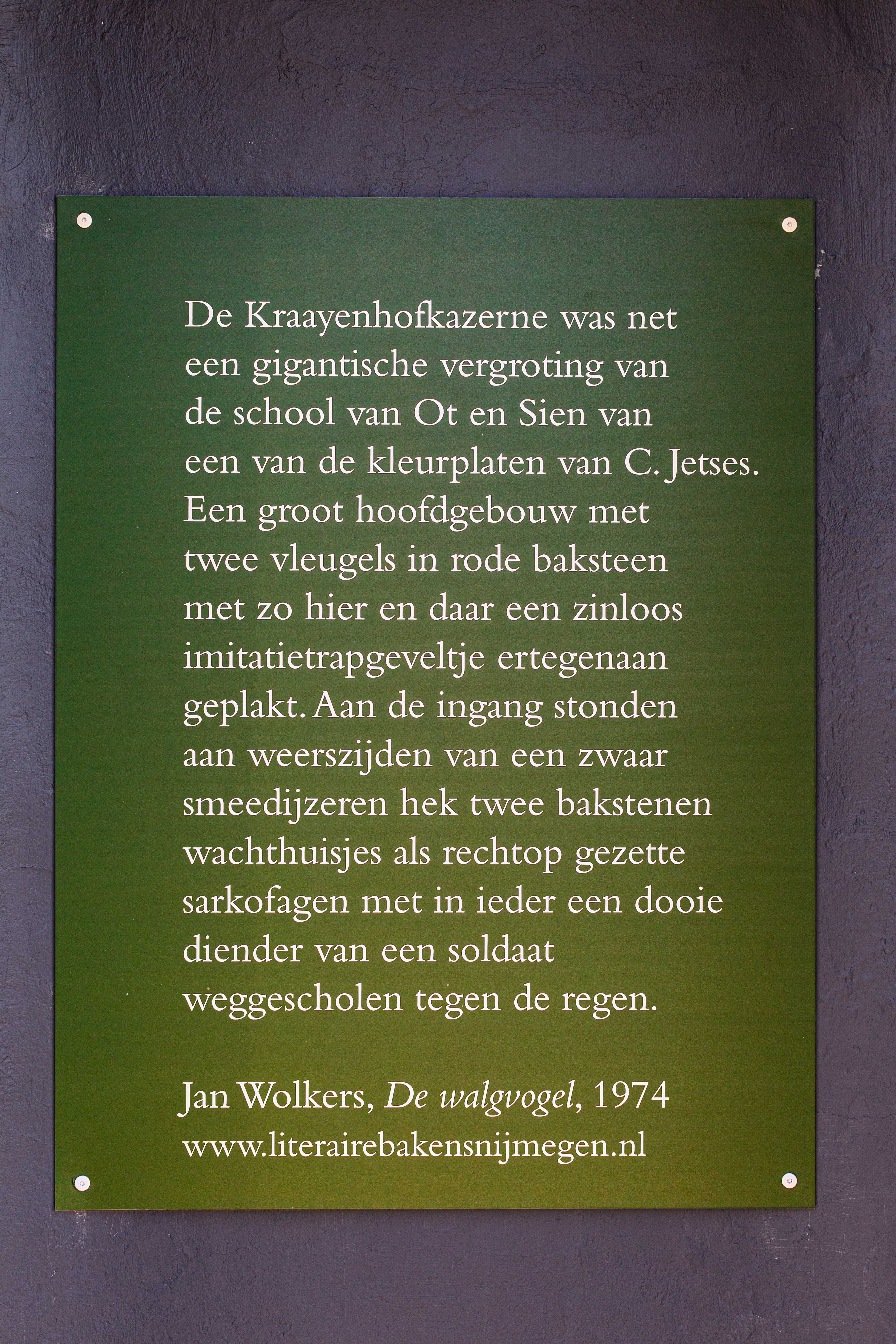 De twee wachthuisjes voor de Krayenhoffkazerne aan de Groesbeekseweg zien er sinds eind februari 2021 weer hetzelfde uit. Had eerst alleen het rechter wachthuisje een literair baken van Jan Wolkers, sindsdien herbergt ook het andere een baken van Wolkers. Beide fragmenten komen uit De walgvogel, zijn roman uit 1974.