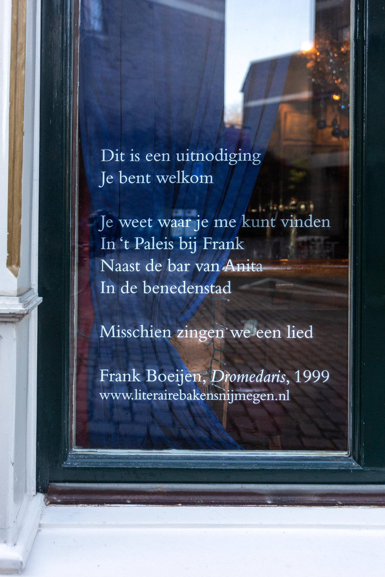 Oorspronkelijk had Frank Boeijen samen met Frans Kellendonk, de schrijver en vertaler die eveneens in Nijmegen geboren is, één literair baken in het Kronenburgerpark. Na een aantal jaren besloot de Werkgroep Literaire Bakens Nijmegen beiden een eigen baken te geven. Het nieuwe baken van Frank Boeijen, dat is aangebracht op een ruit van Café ’t Paleis in de Priemstraat in Nijmegen, werd op 13 september 2019 onthuld door de in het fragment genoemde Frank en Anita. Het nieuwe baken van Frans Kellendonk, dat zijn plaats in het Kronenburgerpark heeft behouden, is begin 2020 gerealiseerd.