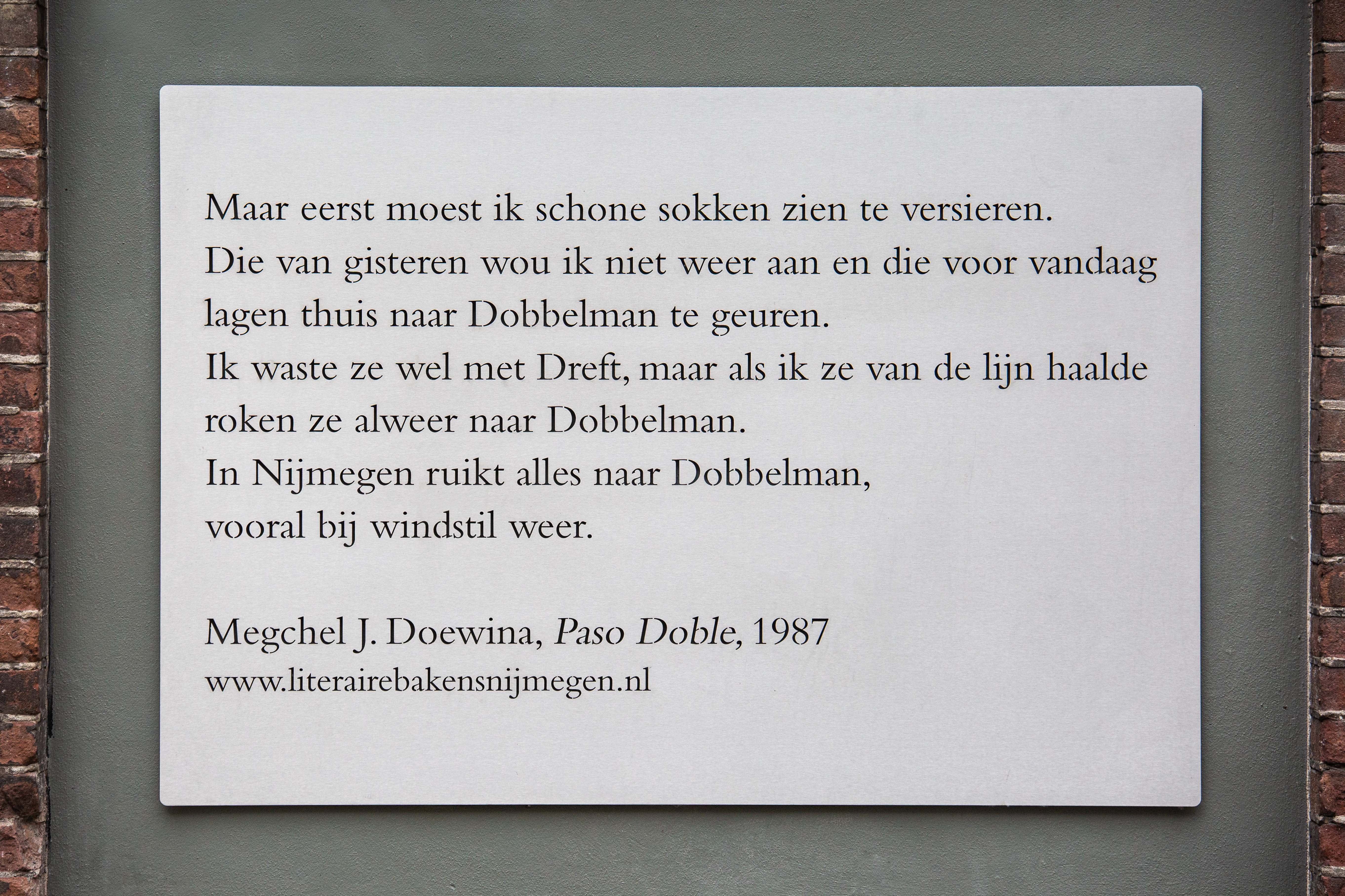 In de Castellastraat, midden op het Dobbelmancomplex in Nijmegen, is op 8 april 2022 het literaire baken van Megchel J. Doewina onthuld. De betreffende tekst is een fragment uit Paso Doble (1987). Deze vrolijk geschreven roman, die begint op de tribunes van het Goffertstadion tijdens een wedstrijd van NEC, heeft in de hoofdrollen twee elkaar en voetbal minnende vrouwen.