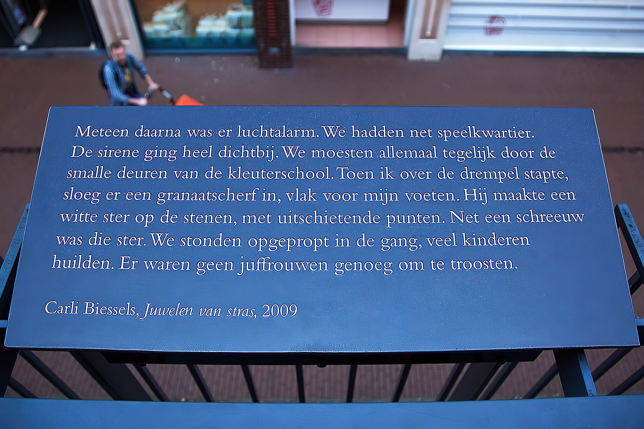 Dit is een fragment uit Juwelen van stras (2009) van de in Nijmegen geboren Carli Biessels (1936-2016). Het verhaal speelt zich grotendeels in Nijmegen af en is deels autobiografisch. Door de ogen van Elske, een ondergedoken joods meisje, beleeft de lezer een indringend verhaal. Elske gaat tijdens haar onderduik in Nijmegen naar de school die zwaar getroffen wordt bij het zogenaamde ‘vergissings-/gelegenheidsbombardement’, het bombardement van geallieerde vliegtuigen op de binnenstad van Nijmegen op 22 februari 1944. Het fragment, als baken onthuld op 22 februari 2012, is bevestigd aan de balustrade van de Marikenstraat tegenover De Schommel, het monument ter nagedachtenis aan de 763 slachtoffers van het bombardement.