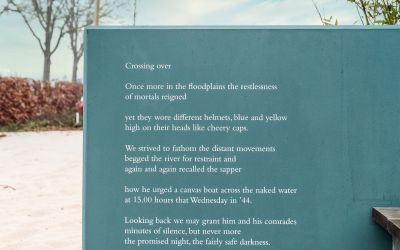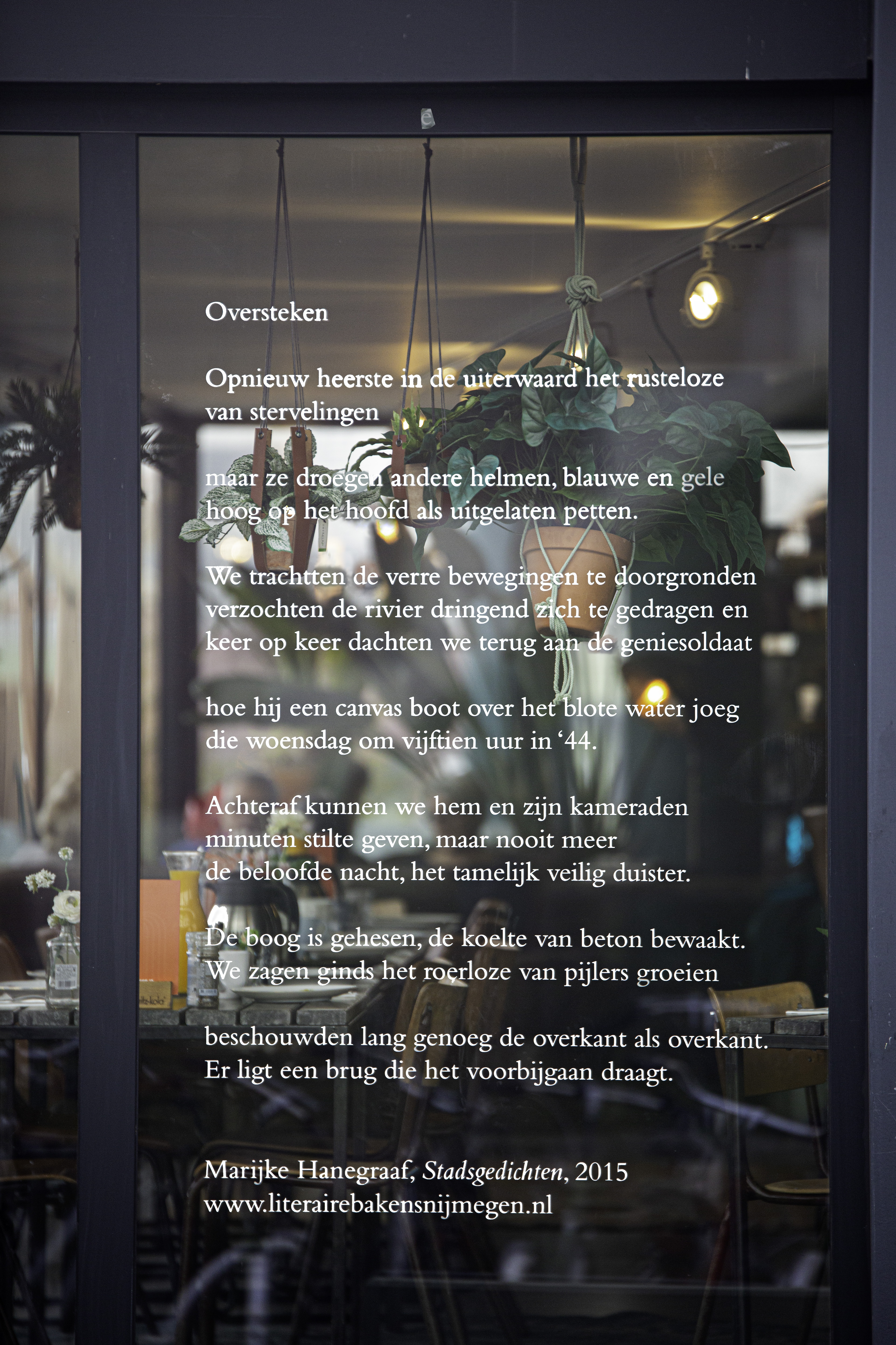 Het gedicht ‘Oversteken’ staat op een raam bij de ingang van Hotel Restaurant Nimma, Weurtseweg 478 te Nijmegen. Op een muurtje van het terras staat de vertaling van het gedicht: ‘Crossing over’ (vertaling: Radboud in’to Languages, zie hieronder). Hotel Nimma ligt aan de voet van stadsbrug De Oversteek die in 2013 werd geopend. Speciaal daarvoor schreef toenmalig stadsdichter Marijke Hanegraaf ‘Oversteken’. In het gedicht worden de bouwers aan de brug over de Waal geassocieerd met de Amerikaanse paratroopers tijdens hun gedurfde, want riskante oversteek daar op 20 september 1944. Die leidde weliswaar tot de verovering van de spoor- en Waalbrug en de volledige bevrijding van Nijmegen, maar daarbij sneuvelden 48 soldaten. Op 20 september 2019 - precies 75 jaar later - werd tijdens de herdenking van Market Garden deze oversteek nagespeeld en kort daarna het gedicht van Hanegraaf onthuld.