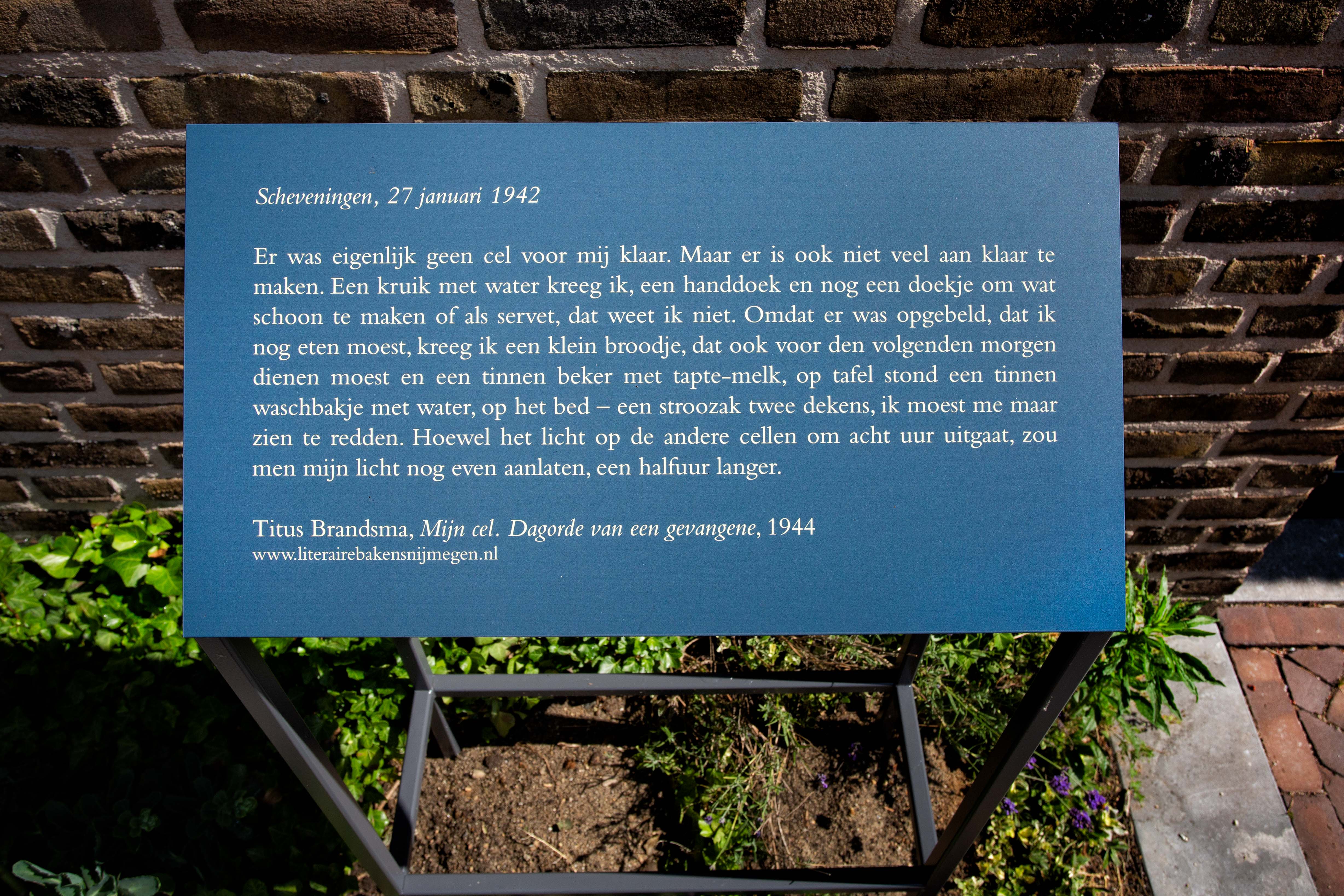 Direct nadat de Radboud Universiteit op 31 mei 2022 de heiligverklaring van voormalig hoogleraar en verzetsheld Titus Brandsma heeft gevierd, is zijn literair baken in de Nijmeegse binnenstad onthuld. Het heeft een plaats gekregen bij de Titus Brandsma Kapel aan de Kroonstraat (Doddendaal). Huub Welzen, Prior Provinciaal van de Nederlandse Provincie der Karmelieten, heeft het baken onthuld na een kleine voordracht en na enkele liederen door de Gregoriaanse schola Karolus Magnus.