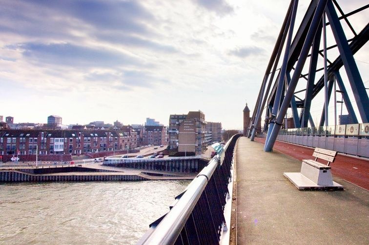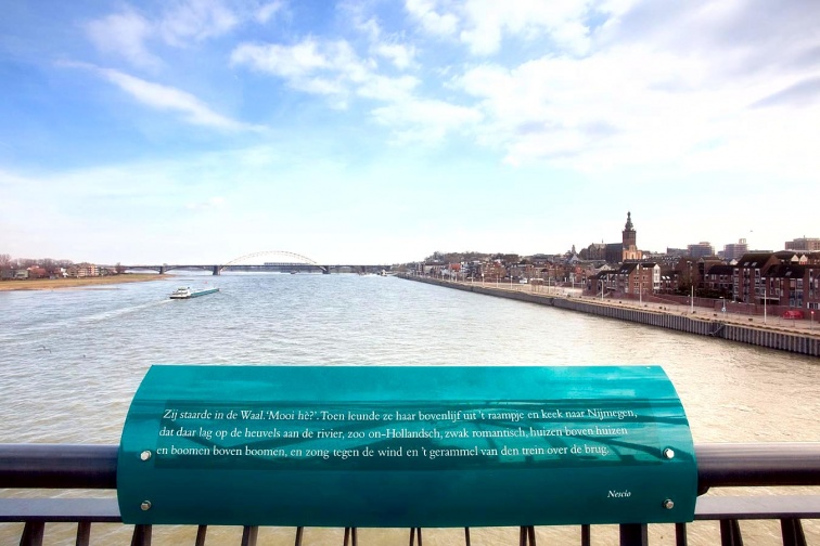 Zij staarde in de Waal. ‘Mooi hè?’ (…) Toen leunde ze haar bovenlijf uit ’t raampje en keek naar Nijmegen, dat daar lag op de heuvels aan de rivier, zoo on-Hollandsch, zwak romantisch, huizen boven huizen en boomen boven boomen, en zong tegen den wind en ’t gerammel van den trein over de brug.
