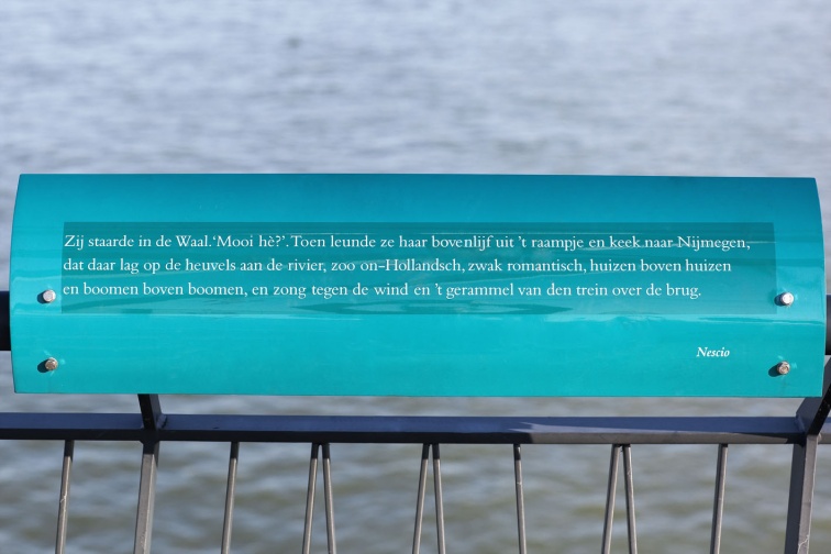 De tekst van het literaire baken (hoewel afkomstig uit Dichtertje) is geplaatst op de spoorbrug, op de plek die overeenkomt met die waarop Japi uit het leven stapt. Want hoewel in de tekst de Waalbrug vermeld is, was op het moment dat Nescio dit schreef de spoorbrug de enige brug over de Waal. De brug die het autoverkeer via de singels de stad in leidt, dateert van 1936.